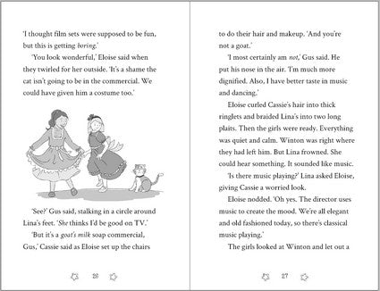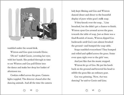 The girls are not deterred by Gus’ complaints and head off with Winton to the film set created at the end of town. Everything goes well until Winton hears hip-hop music spilling from a window. Suddenly Winton is up on two hooves, busting hip-hop moves until the music stops and he returns to normal. Later, Winton starts line dancing to country music. The girls think Winton’s dancing is wonderful, but Gus reminds them the TV commercial is expecting a calm and placid goat. Feeling worried, they decide to keep Winton away from any music that isn’t classical. Thankfully, when Cassie and Lina finally reach the set with Winton, everyone there agrees he’s the perfect animal for the commercial. Of course, Gus doesn’t agree, he’s complaining again, this time about the classical music creating calm vibes in the background. While Gus whines, the girls to dress up in frilly costumes, perfect for a goat’s milk commercial. The director calls for action and the cameras roll. Everything is perfect, Winton is calm and placid, but Cassie and Lina are worried because grumpy Gus, on the other side of the set, is getting distracted. Before the girls can do anything, Gus has unplugged a cord. Tango music blares across the set! Winton runs away, sweeps Gus off his feet and together they high step across the set. Goat’s milk soap goes flying and chaos ensues – all to the horror of Cassie and Lina! They’ve ruined the commercial! Their pet sitting careers are over!The music stops and Winton and Gus beam with satisfaction while Cassie and Lina try to slip away, unseen, until the director calls them back. ‘That cat’, he says, ‘is a star!’ Gus and Winton’s dancing has made the commercial a huge success, and the film crew cheers with delight!