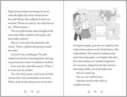 After a fun morning of glittery craft, and with instructions from Cassie’s Dad to clean up the house for the rent inspection, Cassie and Lina are looking after Bella the bearded dragon. They learn that when Bella is cold, she won’t move at all; it’s when she warms up that she gets active. So, while they are getting the lights in her tank set up, the girls put Bella down, confident she won’t go anywhere. Despite the girls’ delight in Bella, Gus is unimpressed with the lizard. ‘She’s so ugly,’ he insists. ‘Cats are far better looking.’ He’s even more disgusted when she sneezes golden glitter all over him. At first, Cassie and Lina like the glitter Bella sneezes, but it soon seems as if Bella is allergic to Gus. Every time he comes close, she sneezes more glitter. It’s beginning to get messy. Then Gus disappears taking Bella to the bathroom so she can look at herself in the mirror. When the girls realise Bella is missing, they call for Gus and he arrives grumpy and completely covered in gold glitter. It seems that Bella’s allergies are getting worse. The girls hurry to the bathroom to retrieve her but despite there being glitter everywhere, Bella is nowhere to be seen. Cassie’s brother’s habit of leaving the heat lights on must have warmed Bella up so she has crawled away out of sight. Flustered at her brother’s forgetfulness, Cassie closes the toilet lid and Gus settles down on it for a nap. The girls search for Bella in the bathroom to no avail, but when they startle Gus, he leaps into the air and lands heavily on the cistern, accidentally flushing the toilet. The girls are distraught, assuming Bella has fallen into the toilet and been flushed away. They give up hope and return to cleaning the house for the quickly approaching rent inspection. But as they get to work, they notice new splashes of gold glitter and realise that Bella hasn’t been flushed after all. She’s somewhere nearby, and they’re going to need Gus’ help to find her. One sneeze of golden glitter later and Bella is rescued from under the fridge, just in time for the rent inspection. Gus saves the day once more.