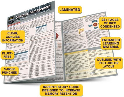 Essential reference and test prep for the strategic management college course for students, and a great tool for business professionals. This handy 6-page laminated reference is perfect for students and a musthave for anyone striving for success in business. Quickly reference the concepts, terms, and principles of a sound business strategy for communication in and across teams or for personal business planning and development. Author, professor, and business consultant Dr. Kyle Kelly uses his multi-faceted knowledge and experience from teaching and consulting to give you succinct need-to-know facts in our famous QuickStudy® format that offers more answers per page than any other source. Color-coded sections bulleted for easy access are developed to see the whole scope of how the pieces fit together for a price that cannot be beat for the knowledge gained. Adopt this tool for your students, or add it to your business team toolbox.