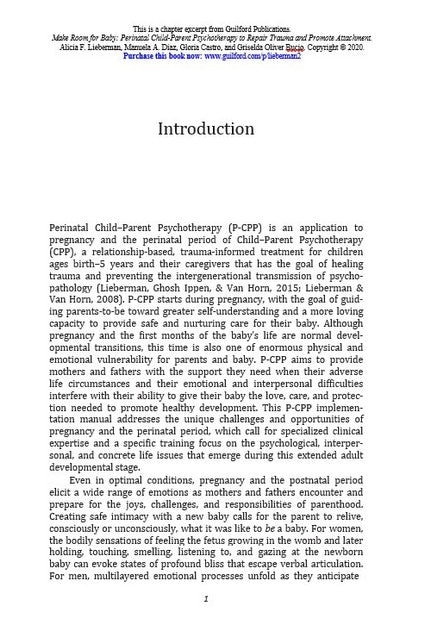 Alicia F. Lieberman, PhD, is Irving B. Harris Endowed Chair in Infant Mental Health and Professor and Vice Chair for Faculty Development in the Department of Psychiatry at the University of California, San Francisco (UCSF). She is Director of the UCSF Child Trauma Research Program at Zuckerberg San Francisco General Hospital (ZSFGH) and Director of the Early Trauma Treatment Network. Dr. Lieberman is the senior developer of Child-Parent Psychotherapy (CPP). She is the author of The Emotional Life of the Toddler, for general readers, as well as professional books, articles, and chapters on childhood exposure to violence, mental health in infancy and early childhood, child-parent attachment, and cultural competence in intervention. Her cross-cultural background as a Jewish Latina informs her work with diverse children and families. Dr. Lieberman has received numerous awards including, most recently, the Rene Spitz Award from the World Association for Infant Mental Health, the Hero Award from the San Francisco Department of Public Health, the Whole Child Award from the Simms/Mann Institute, the Blanche Ittleson Award from the Global Alliance for Behavioral Health and Social Justice, and the Paulina Kernberg Award from Weill Cornell Medicine. Manuela A. Diaz, PhD, is a clinical psychologist in private practice in Berkeley, California, where she specializes in maternal and infant mental health and the application of mindfulness and neuroscience to the treatment of mood disorders and trauma. Dr. Diaz is an affiliated clinician at the University of California, San Francisco (UCSF), Child Trauma Research Program at Zuckerberg San Francisco General Hospital. Since the early 2000s, she has conducted clinical work and research in the area of perinatal mental health. She is a coauthor of the Mothers and Babies course, a maternal depression prevention program developed at UCSF, and a codeveloper of Perinatal Child-Parent Psychotherapy. Dr. Diaz has served as a trainer both nationally and internationally, in English and Spanish, and has published on reducing mental health disparities for racial and ethnic minority groups. Gloria Castro, PsyD, a clinical psychologist and Certified Sexual Assault Counselor, is a bilingual psychotherapist at the University of California, San Francisco, Child Trauma Research Program at Zuckerberg San Francisco General Hospital. In this role, she implements Perinatal Child-Parent Psychotherapy throughout pregnancy, labor, delivery, and postpartum with women with histories of traumatic experiences. She also provides infant mental health services in the neonatal intensive care unit and the high-risk pediatric Kempe Clinic. Dr. Castro's interests include the impact of immigration on family systems, the intergenerational transmission of trauma, and the impact of trauma on children's development. She has consulted for, supervised, and trained mental health providers who work with immigrant families and their children, and has presented her work nationally and internationally. Griselda Oliver Bucio, LMFT, is a psychotherapist in private practice in Walnut Creek, California. For over 14 years, she was a staff clinician and clinical supervisor at the University of California, San Francisco, Child Trauma Research Program at Zuckerberg San Francisco General Hospital, where she also participated in clinical research. Ms. Oliver Bucio specializes in the treatment of young children exposed to trauma and of pregnant women exposed to domestic violence and other traumatic events. She has served as a Child-Parent Psychotherapy (CPP) trainer and consultant since 2010, leading trainings and presentations nationally and internationally in both English and Spanish. Her major interests include infant mental health, the impact of early trauma within the dyadic relationship and pregnancy, disorders of attachment, the effects of paternal absence, the process of immigration in Latino families, and the dissemination of CPP and Perinatal Child-Parent Psychotherapy (P-CPP).