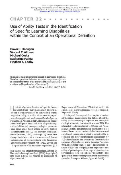 Dawn P. Flanagan, PhD, is Professor of Psychology at St. Johns University in Jamaica, New York, and Affiliate Clinical Professor at Yale Child Study Center, Yale University School of Medicine. She serves as an expert witness, learning disability consultant, and test/measurement consultant and trainer for organizations nationally and internationally. Dr. Flanagan is a Fellow of the American Psychological Association (APA) and a Diplomate of the American Board of Psychological Specialties. She received the inaugural Contributions to Practice Award from Division 16 (School Psychology) of the APA. She has published extensively on cognitive assessment, specific learning disabilities, and psychometric theories of the structure of cognitive abilities. Dr. Flanagan is also an author of the Cross-Battery Assessment Software System (X-BASS). Erin M. McDonough, PhD, is the founder and owner of Psychological Diagnostic Evaluations of New York. She specializes in psychological assessment for the purpose of identifying learning disabilities and other disorders that interfere with achieving full academic potential. Her mission is to help parents understand why their children struggle and what can be done to help their children succeed. Dr. McDonough has trained clinical and school psychology graduate students in psychological assessment at St. Johns University and Rutgers, The State University of New Jersey. She also directed a diagnostic center affiliated with a school for students with dyslexia and other learning disabilities. She presents locally and nationally to school-based professionals on topics related to psychological assessment and learning disabilities.