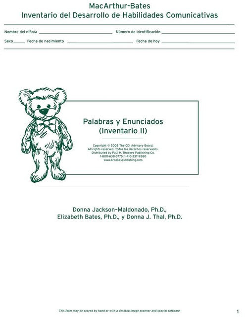 SAVE when you order this item as part of a set. Inventario II: Palabras y Enunciados, sold in packages of 25 for easy re-ordering, is one of the two standardized, parent-completed report forms that make up the the Spanish adaptation of the MacArthur Communicative Development Inventories (CDIs), which was designed by top language researchers to assess language and communication skills in young children ages 8-30 months. With the Inventarios, professionals can tap into parents' invaluable day-to-day knowledge about their children's language and communication skills--and respond to legislation that requires parental input in child evaluations. The forms focus on current behaviors and salient emergent behaviors that parents can recognize and track. Numerous studies document the reliability and validity, clinical utility, and research potential of the CDIs and Inventarios. The CDIs were normed on approximately 1,800 children in three locations, and the Inventarios were normed on more than 2,000 children. The CDI and Inventario forms were developed separately to reflect the vocabulary and grammatical structure of each language. Inventario II: Palabras y Enunciados is a "words and sentences" form for use with children ages 16-30 months. In the first part of the form, parents document the child's production and use of hundreds of words divided into semantic categories. The second part analyzes the child's early forms of grammar and the complexity of the child's multi-word utterances. Parents identify the words the child has understood or used and provide written examples of the child's three longest utterances. This form generally takes 20-40 minutes to complete and 20-30 minutes to score by hand. Also available are the Inventario I: Primeras Palabras y Gestos and the User's Guide and Technical Manual. These forms are part of the MacArthur-Bates Inventarios del Desarrollo de Habilidades Comunicativas (Inventarios). The Inventarios and their English version, the CDIs, are standardized, parent-completed report forms that track young children's language and communication skills. Top language researchers developed the report forms, designing them to focus on current behaviors and salient emergent behaviors that parents can recognize and track. This product is sold in a package of 25. Learn more about the MacArthur-Bates CDIs.