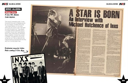 INXS fans are the central focus of this official publication Calling All Nations: A Fan History of INXS. Named after the INXS song, with over 400 pages of fan accounts, memorabilia, artifacts, photographs, magazine and newspaper clippings. Artfully arranged, the popping graphics of the book revolve around INXS’ signature black, white and red.