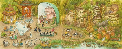 This is a dog walk like no other, through amazing fairy-tale worlds, paintings come to life, Escher-esque castles, an intricately cluttered antique shop, and past countless delights: walking teapots, miniature steamboats, giant hedgehogs and islands with sails.