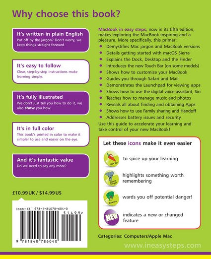 MacBook in easy steps, 5th edition focuses on this area of mobile computing and contains all of the information the reader needs to use a MacBook for both business and pleasure. The book looks at the specifications and hardware of MacBooks and details how to get up and running with this attractive, stylish and highly functional laptop. It covers the Mac operating system in detail, including how to use the internet and email, networking and sharing with family members. In order to get the most out of a MacBook there is also a chapter about using it as a fully mobile device, on the road, in the office or on holiday. MacBook in easy steps, 5th edition covers the new features in the new macOS Sierra operating system, which include: