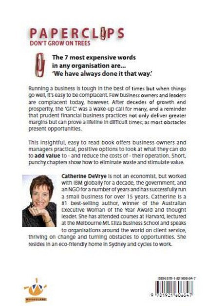 The 7 most expensive words in any organisation are...We have always done it that way. Running a business is tough in the best of times but when things do go well, its easy to be complacent. Few business owners and leaders are complacent today, however. After decades of growth and prosperity, the GFC has been a wake-up call for many, and a reminder that good and prudent financial business practices not only deliver greater margins but can prove a lifeline in difficult times. From Wall Street to Main Street, times are still fairly tough and most business owners and middle managers are still nervous about personal finances and job security. What - if anything - can be done by the average man or woman in the workforce to secure their business and their role? Most obstacles present opportunities. An economic downturn may be an opportunity in disguise to assess the strengths and weaknesses of your overall business. Paper Clips Dont Grow On Trees offers readers some practical, positive options to look at what theyre doing well in terms of adding value - and reducing costs - to their operation. The author is not an economist, but worked with IBM globally for a decade and has successfully run a small business for 17 years. Catherine DeVrye is a best-selling author and winner of the Australian Executive Woman of the Year Award. She speaks to organizations around the world on client service, thriving on change and turning obstacles to opportunities.
