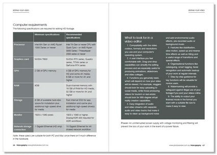 Videography teaches you how to create high quality videos. This easy to read, fully illustrated guide starts with advice on selecting the most suitable camera for your videos, covering everything from smartphones through to professional equipment. Videography shows you the key camera settings and provides advice on recording soundtracks, time-lapse and interval recording. This book gives you expert video shooting tips on focusing, steadiness, aperture, depth of field, framing, audio, lighting, and continuity. Videography includes advice on editing your video, the best software to use, and the many ways you can share your videos.