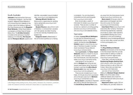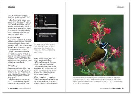 Bird Photography helps you decide which kinds of birds to photograph, where you’re most likely to find them, and the type of equipment that will give you the best results. This handy guide shows you how to:* Select the right camera and lens for different types of bird photos.* Adjust camera settings for a variety of shots.* Record backlit subjects and manage contrasty lighting.* Assess ISO settings in dim lighting or with slow telephoto lenses. * Use autofocusing, drive modes, shooting modes and AF metering.* Choose the right file formats, shutter and ISO settings.* Shoot handheld and manage stabilisation.Bird Photography also covers useful accessories like supports, teleconverters, and filters, and provides a list of the best bird locations and birdwatching hides around Australia.