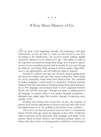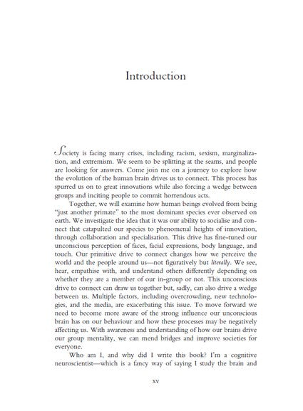 Introduction Part I: Humans as a Connected Species 1 A Very Short History of Us 2 Why We Think without Knowing 3 Identifying People 4 A Puppet on a String Part II: How Does Connection Work? 5 We Are Pack Animals 6 Connected to Learn 7 Home-Cooked Meal for the Soul Part III: The Negative Consequences of Our Drive to Connect 8 Racism, Sexism, and Other -Isms 9 Viral Viruses 10 A Crowded Room 11 Modern Technology Thrives on Connection Part IV: How Can We Fix It? 12 Common Humanity Perspective 13 Get Real 14 Connected Development 15 The Future for the Connected Species