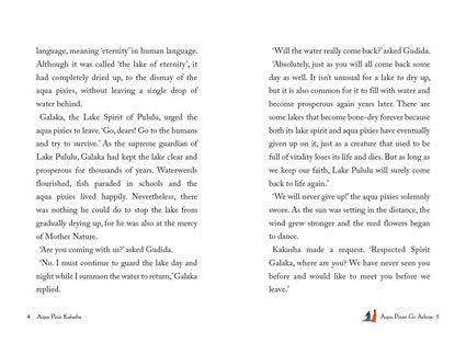 When Tilly befriends an ugly and feared old woman in her village, she is surprised to discover that she is really an aqua pixie! Faithfully waiting for rain to come and restore her lake, aqua pixie Kakasha has been in hiding for many years. Can Tilly help her find her way back home or will Kakasha give up on Lake Pululu and become a real human?